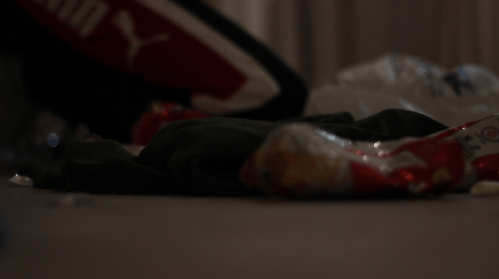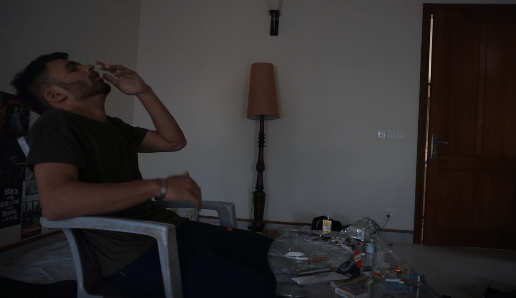 Tarawish and I went to Ashar’s place and with Ashar’s help, emptied the entire bag which had the props in it. First thing we did was, we emptied the entire bag of trash that I had got(which included food packets, drink cans, cigarette packs, cigarette ash) and we scattered it all around the room. We set the duvet as a bed for my character, in the corner of the room. We found a place for some alcohol bottles to keep, a cheap-CRT Television and a table where he would usually keep his entire drug material on. I set the table right in the center of the room because it had to be used in a 360 shot, where the character is doing all kinds of drugs and the camera roams around him in circles, which will be later sped up in post to give a timelapse look. Last thing we did was put on the posters we had got, on the wall.